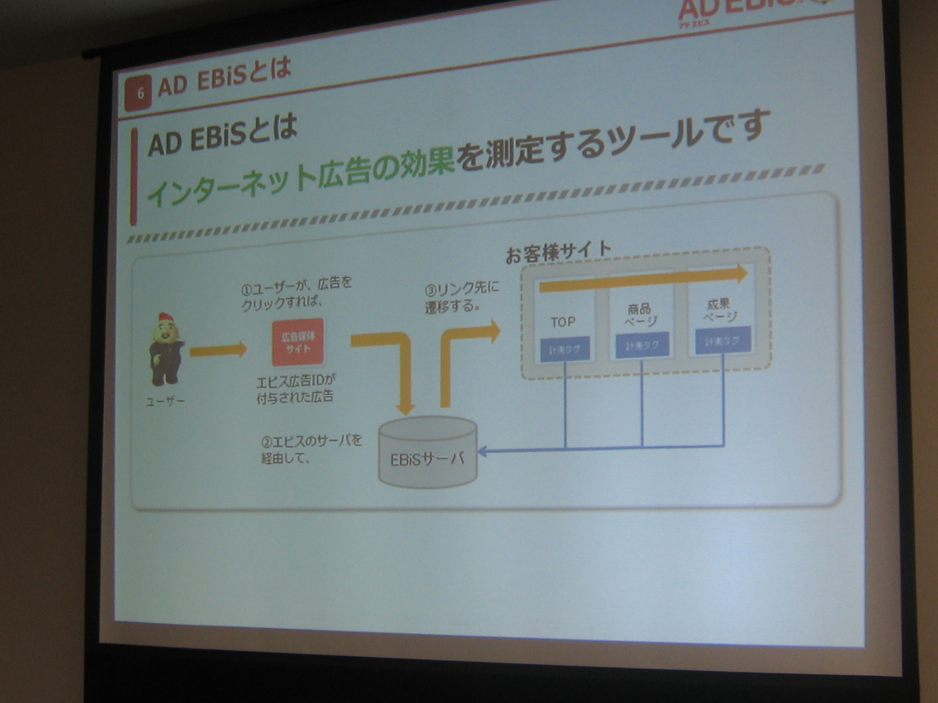 株式会社ロックオンといえばEC-CUBEが有名ですが、AD EBiSという広告効果測定サービスも提供しているそうです。バナーなどの広告と、バナーをクリックした先の誘導先サイトの間にAD EBiSサーバーを置くことで、広告がどれくらいクリックされたか等を計測することができます。