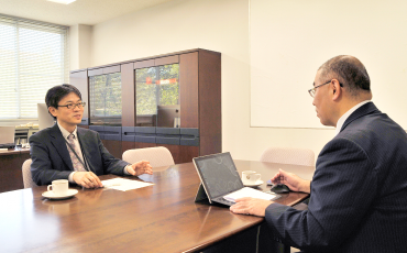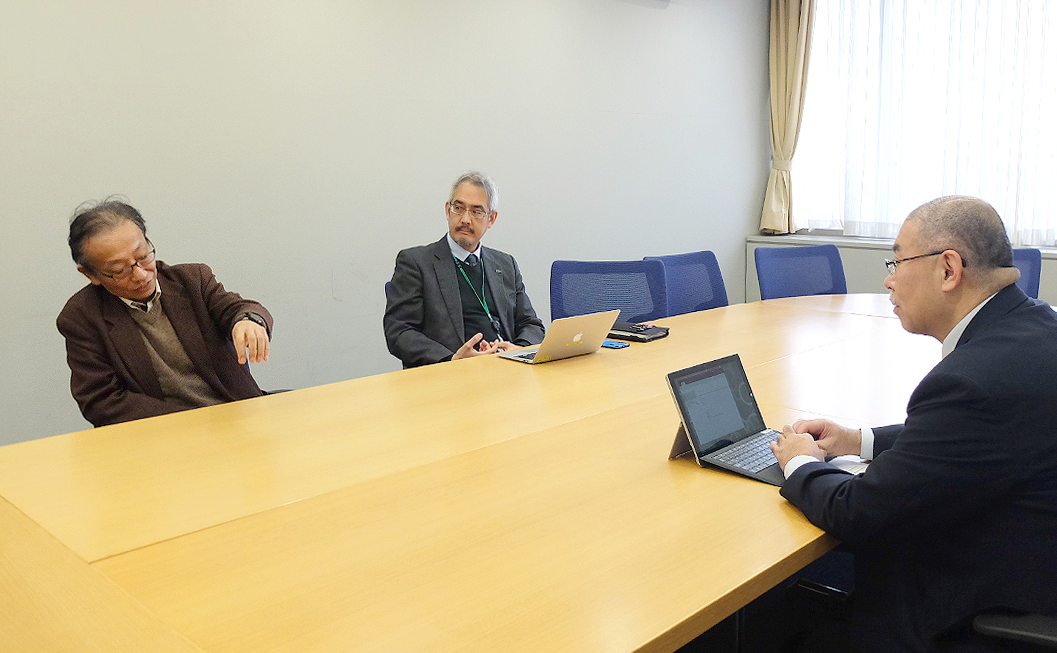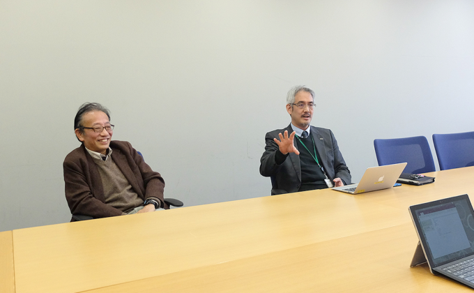 (上部写真:武蔵学園理事・小野成志さん(左手前)と、武蔵大学情報システム部部長・緒方淳さん(左奥)に取材するさくらインターネット・滝島(右))