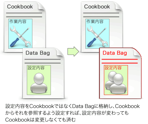 Data Bagは任意のデータを格納できるデータベースのようなもので、Recipeからその内容を参照できる。たとえばユーザーを作成する例の場合、Data Bagに作成するユーザーの情報を格納し、Recipe側ではData Bagからデータを順次読み出してユーザーを作成するという処理を記述すれば良い。