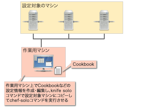 knife-soloを利用することで、作業用マシン上でCookbookなどを一元管理することができ、Cookbookを変更した際も簡単に設定対象のマシンにそれを反映させることが可能になる。