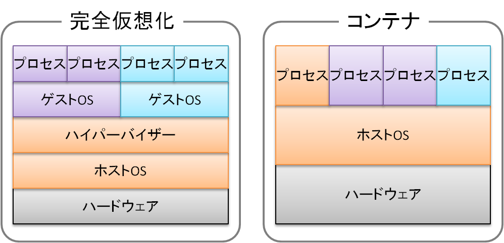 ちなみに、コンテナ技術は仮想化技術と同列視されますが、KVMやXenなどの完全仮想化とは全く異なるものです。KVMやXenなどがハードウェアのエミュレーションを行ってホストとは異なるOS空間になっているのに対して、コンテナの場合は単一のOSを見かけ上分割しているだけで、ホスト側でpsを行うとゲストのプロセスも含めて全てのプロセスが表示されます。