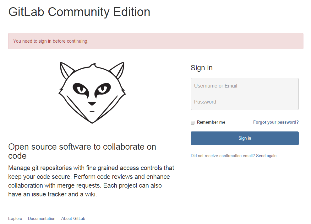 # rpm -ivh install gitlab-7.5.3_omnibus.5.2.1.ci-1.el6.x86_64 Thank you for installing GitLab! Configure and start GitLab by running the following command: sudo gitlab-ctl reconfigure GitLab should be reachable at localhost Otherwise configure GitLab for your system by editing /etc/gitlab/gitlab.rb file And running reconfigure again.