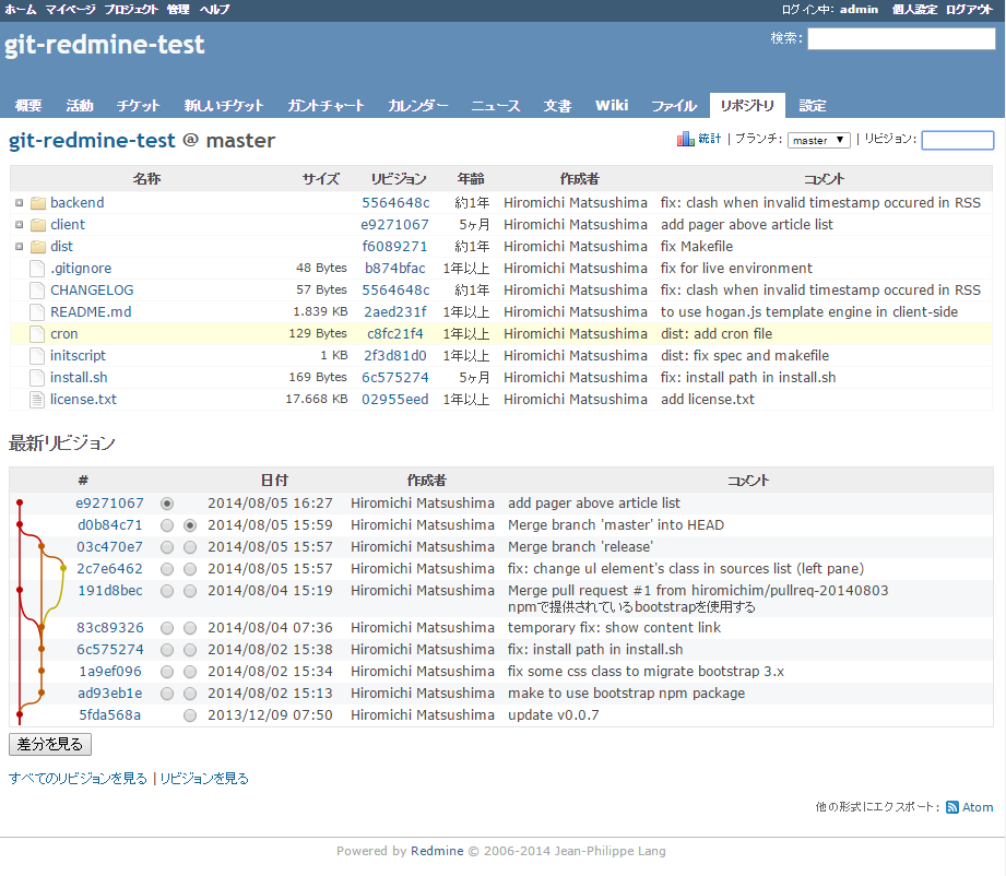 また、Tracはチケット管理機能とWikiを中心とするプロジェクト管理ツールだ。Redmineと同様にプラグインで機能を拡張できるが、Tracの場合は本体部分は最小限の機能のみを持ち、プラグインで必要な機能を追加するような設計になっている。Gitリポジトリサポートもプラグインによって実現されている(図8、9)。