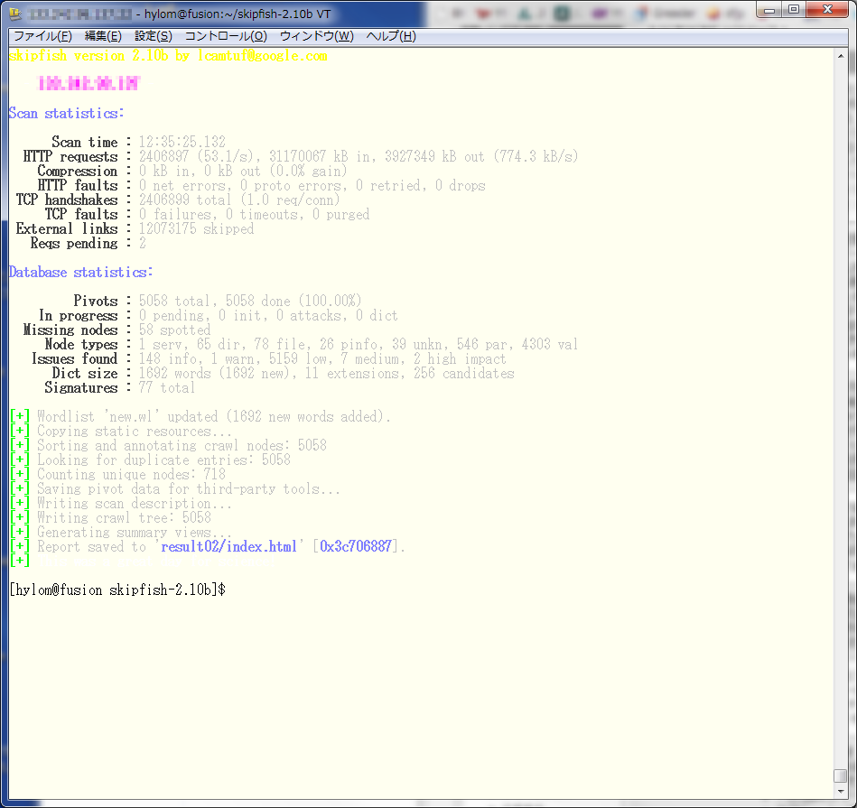 $ ./skipfish -W- -L -o <出力ディレクトリ> <クロールを開始するURL>