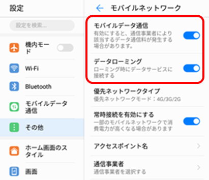 そして、通信を有効化するために、「モバイルデータ通信」や「データ通信を有効にする」の項目と、「データローミング」のどちらも「有効」にする必要があります。