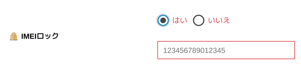 「IMEIロック」を「はい」にすると「IMEI」の入力欄が表示されます。IMEI についての詳細は IMEIロック設定変更 のマニュアルを参照ください。