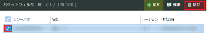 1. パケットフィルタ一覧から削除したいパケットフィルタのチェックボックスにチェックを入れ 、『 削除 』をクリックします。