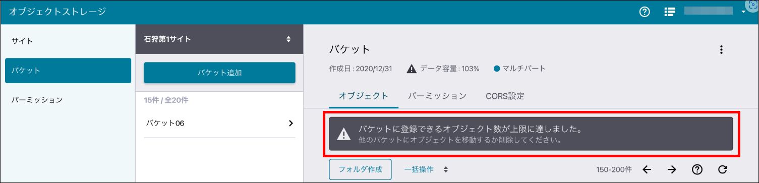 バケットの容量やオブジェクト数が制限値を超過した場合、コントロールパネル上部に警告が表示されます。