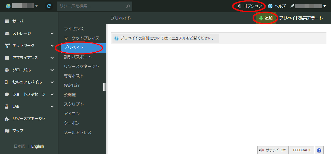 コントロールパネル右上の「オプション」をクリックして表示されたオプションメニューの「プリペイド」をクリックすると、お申し込みされたプリペイドの一覧が表示されます。新たに申し込む場合は「追加」ボタンをクリックします。