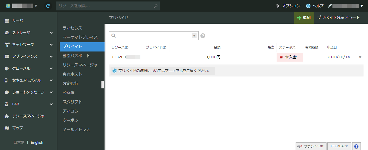プリペイドIDが発行されたのみの状態ではご利用料金へ充当することができません。発行後は以下の手順でクラウドのコントロールパネルよりプリペイドIDの登録作業が必要となります。