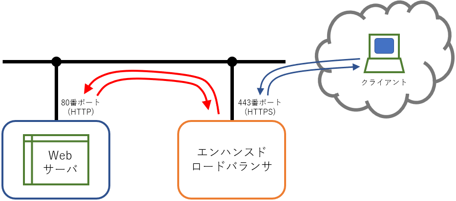 という流れに変化します。つまり、エンハンスドロードバランサがHTTPSで応答することにより、既存のWebサーバに手を加えることなくHTTPS接続環境が実現できます。具体的な手順は以下の通りとなります。
