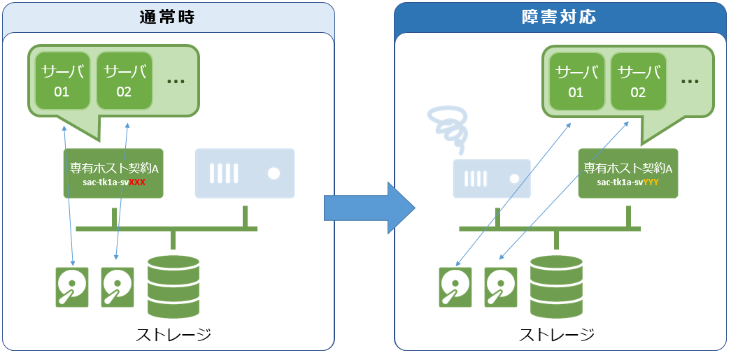 お客様へ提供している専有ホストで機材故障やさくらのクラウド仮想基盤ソフトウエアのバージョンアップなどのメンテナンス作業が発生した際には、以下の対応となります。