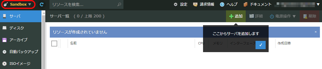 SandboxゾーンではコントロールパネルやAPIでの操作テスト用の環境です。実際に作成されたリソースは本来の機能としての動作は行われないため、サーバやディスクの性能テストやサーバへログインしてのご利用はできません。