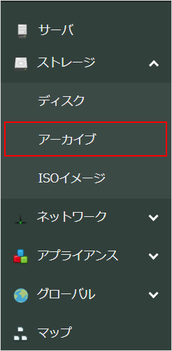 コントロールパネル左側の「ストレージ」カテゴリ下部におある「アーカイブ」をクリックします。