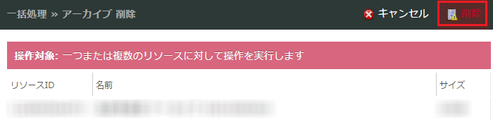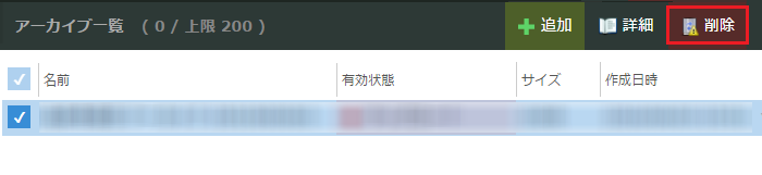 削除したいアーカイブのチェックボックスにチェックを入れ「削除」をクリックします。