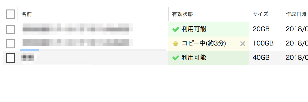 ソースが他ゾーンのアーカイブ、またはVPSディスクの場合、有効状態は「転送中」となり、完了までの目安時間は表示されません。サイズや混雑状況などにより大きく時間がかかる場合がありますのであらかじめご了承ください。