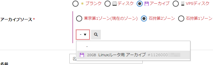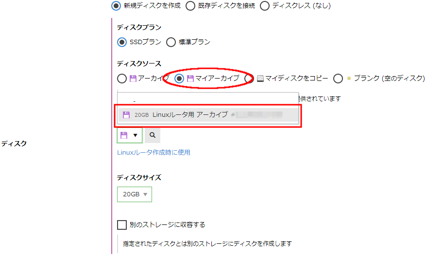 | 新規作成時にソースとして指定可能なもの | ・同一ゾーン内のディスク ・パブリックアーカイブ ・同一ゾーン内のマイアーカイブ |