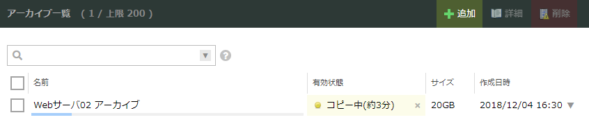 ソースからのデータコピーが開始され、アーカイブ一覧画面の有効状態が「作成中」または「転送中」のステータスとなります。