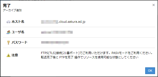 作成後にFTPでアップロードするための接続情報が表示されるので、ここで手元のPCに保存されたディスクイメージなどをアップロードすることができます。