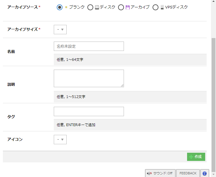 アーカイブソースは、デフォルトの「ブランク」を指定すると何も内容が入っていない状態のアーカイブが作成されます(作成後にFTPアップロードやコピー機能でイメージを格納することが可能です)。 しかし、「ディスク」、「アーカイブ」、「VPSディスク」を選択することで、作成完了時にそれぞれ指定したソースのディスクイメージがあらかじめ格納された状態のアーカイブを作成することが可能です。