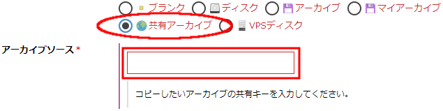 共有キーが分かれば、どのユーザでも、どのゾーンでも対象のアーカイブをソースとしたアーカイブを作成することができます。新規作成画面のソース選択ラジオボタンで「共有アーカイブ」を選択すると下に共有キー入力欄が表示されるので、ここに共有された対象アーカイブの共有キーを入力します。
