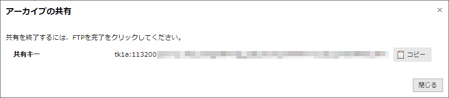 注意事項の表示を確認し共有作業を進めると共有キーが表示されます。「コピー」ボタンをクリックすることでコントロールパネル操作中の端末のクリップボードに共有キーの文字列をコピーすることができます。