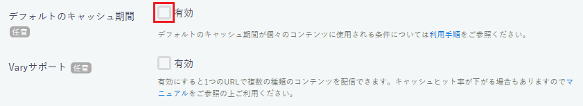 - オリジンサーバのレスポンスヘッダにキャッシュを無効にするヘッダが含まれるなど、 デフォルトのキャッシュ期間設定の適用対象外条件 に一致する条件がある場合は、デフォルトのキャッシュ期間設定は無視されます。