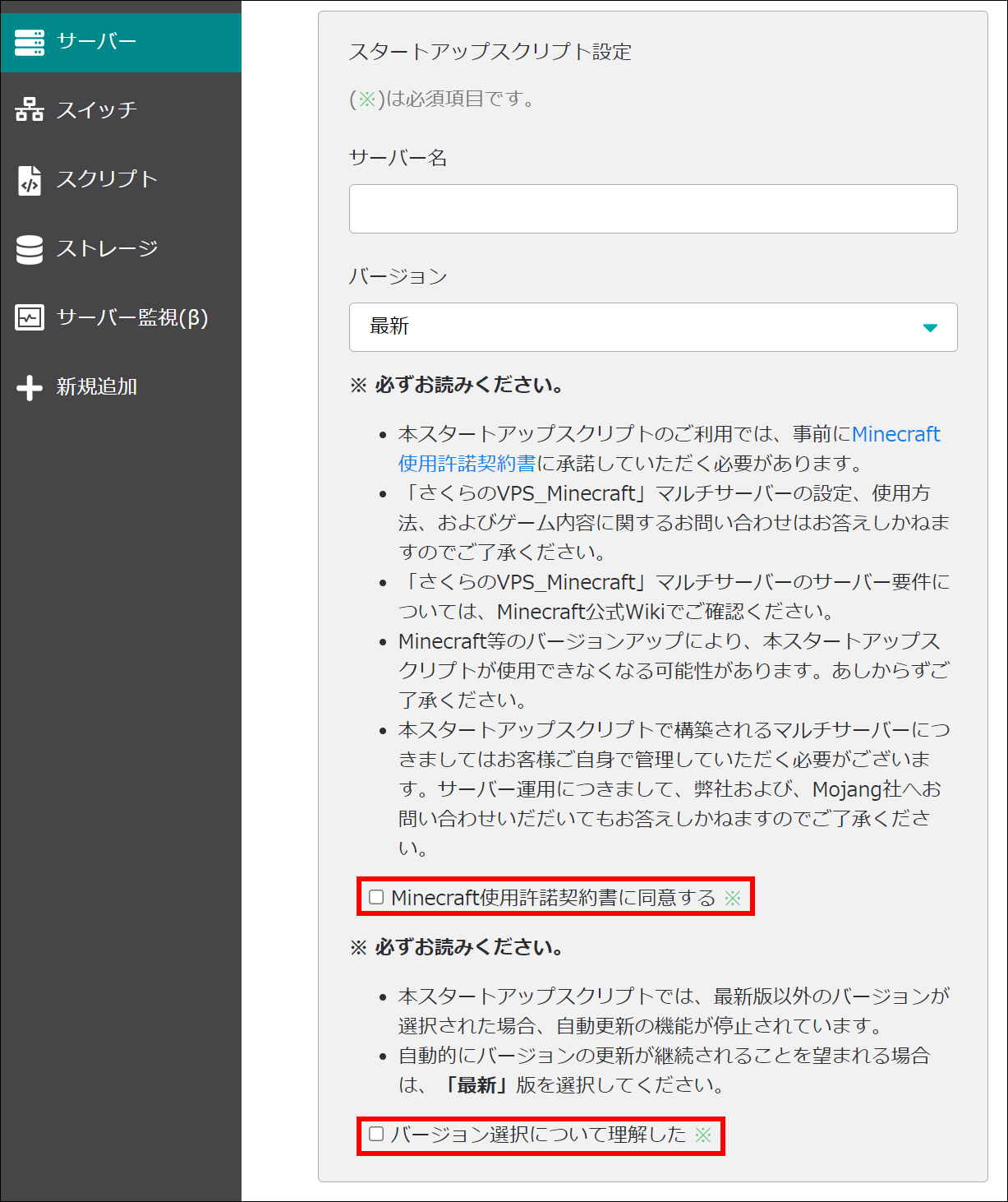 「Minecraft Server(Java版)」のご利用に当たり、事前に下記規約への承諾をお願いします。