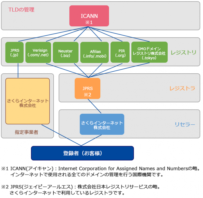 レジストリは直接登録者とは契約を結ばず、レジストラもしくはリセラーを通して契約をします。レジストラやリセラーごとに値段や管理方法が異なるのもこのためです。 少し細かい話になってしまいましたが、「ドメインを取得する場合は、さくらインターネットのようなリセラーに依頼する必要がある」という点を押さえておきましょう!