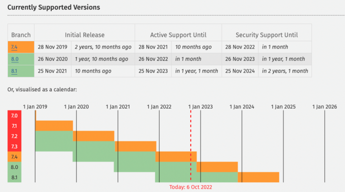 PHPの各バージョンにはサポート期限が設けられており、期限を過ぎるとバグやセキュリティリスクへの対応が行われなくなります。身近な例だと消費期限的なものと捉えていただくと分かりやすいでしょうか。期限が切れた瞬間直ちに何か問題が発生するものではありませんが、潜在的なリスクを抱えることになるので、速やかにサポート対応内のバージョンを使用することをおすすめします。