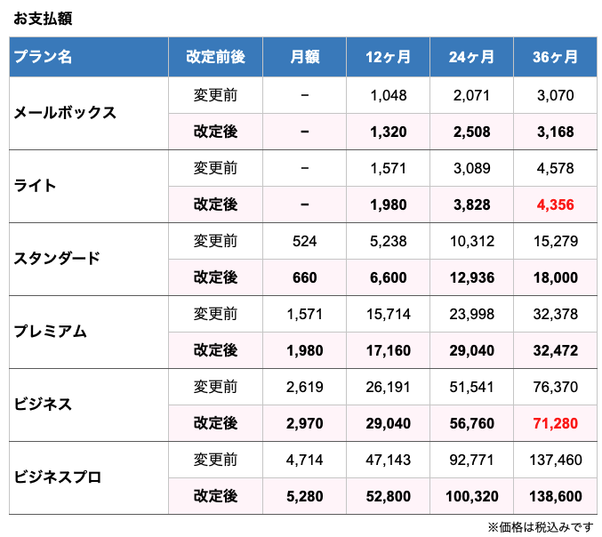 お支払額と月額換算価格の前後比較表を作成しましたのでご覧ください。基本的に長期契約をいただくと改定前との価格差が小さくなるようなプライシングになっています。特に赤字は改定前から値下がりしている部分です。(間違いではないですよ!)