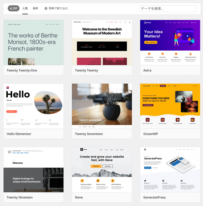 テーマとはWordPress1サイトにつき1つだけ設定できる、レイアウトや色・装飾などの見た目、その他独自のカスタマイズが施されたセットのようなものです。文字主体のブログに向いているもの、写真主体のもの、企業サイト向けのものなど様々な種類が公開されています。