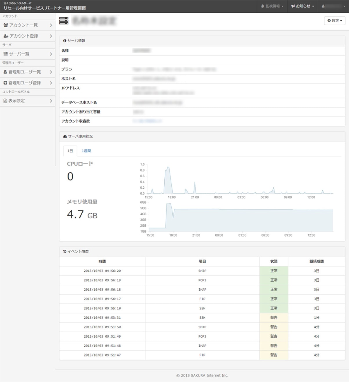 目的に合わせた多彩な管理が可能エンドユーザーのアカウント登録・停止・削除はもちろん、サーバモニタリング機能、APIキーの追加など、全て管理画面から簡単に行うことができます。
