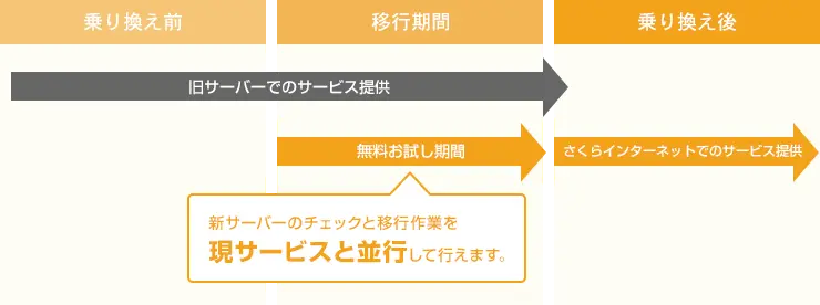 2週間の無料期間に旧サーバーと並行して移行作業を行うことができます。