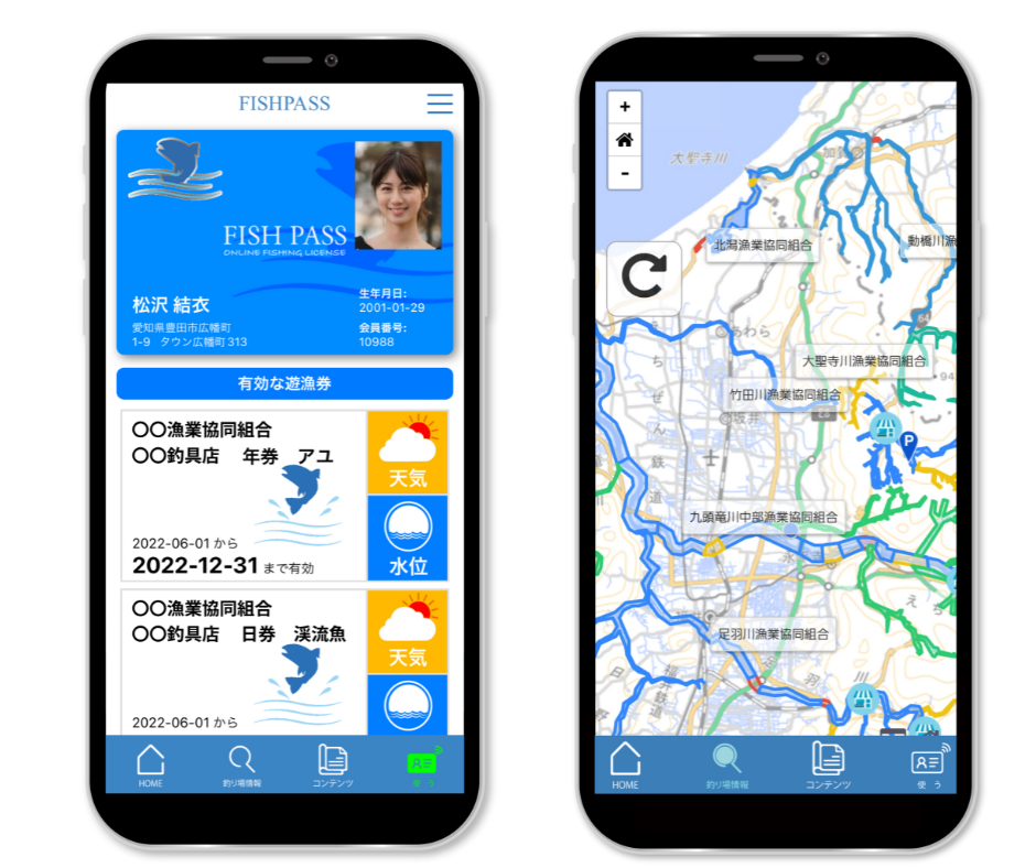 FISH PASSの画面。遊漁券(左)と、管轄している組合が表示された河川のマップ(右)