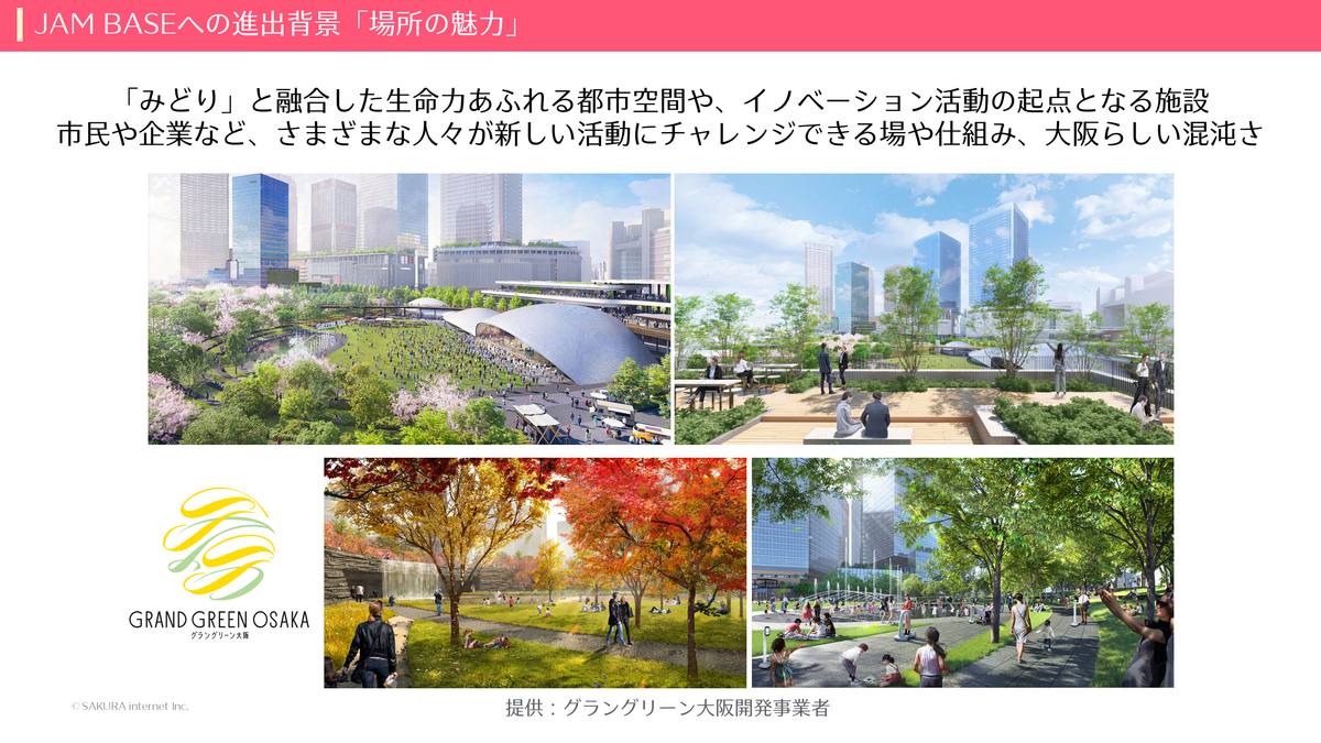 さくらインターネットは、2024年9月に先行まちびらきを迎えるグラングリーン大阪へ、オープンイノベーションを起こすための取り組みの一環として進出を決定いたしました。ビジョンである「『やりたいこと』を『できる』に変える」を実現するコミュニケーションの場を目指し計画を進めています。