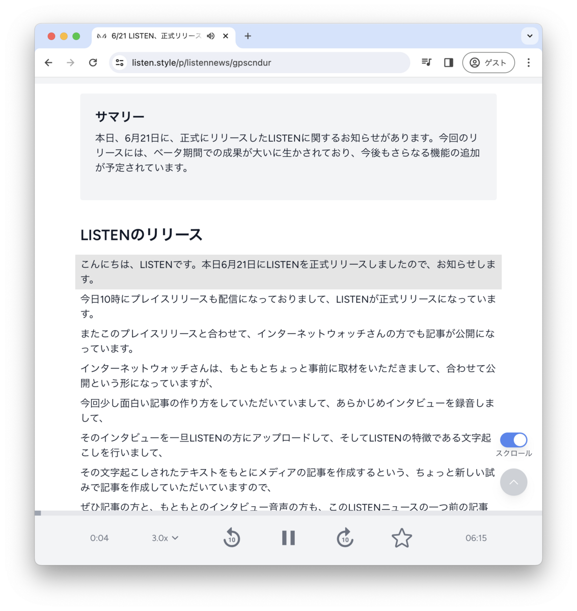 「開発のきっかけは、Whisperの登場でした。音声から高精度の文字起こしができる音声認識AIで、話してポッドキャストを投稿するだけでブログのようなコンテンツを作ることができれば便利じゃないか、というアイデアが出発点です。2023年4月にサービスリリースして、8月にはポッドキャストを直接配信できるホスティング機能をはじめました。それにより、LISTENに音声をアップロードして各種ポッドキャストサービスに直接配信できるようになり、音声コンテンツの配信プラットフォームとしての機能を備えています」