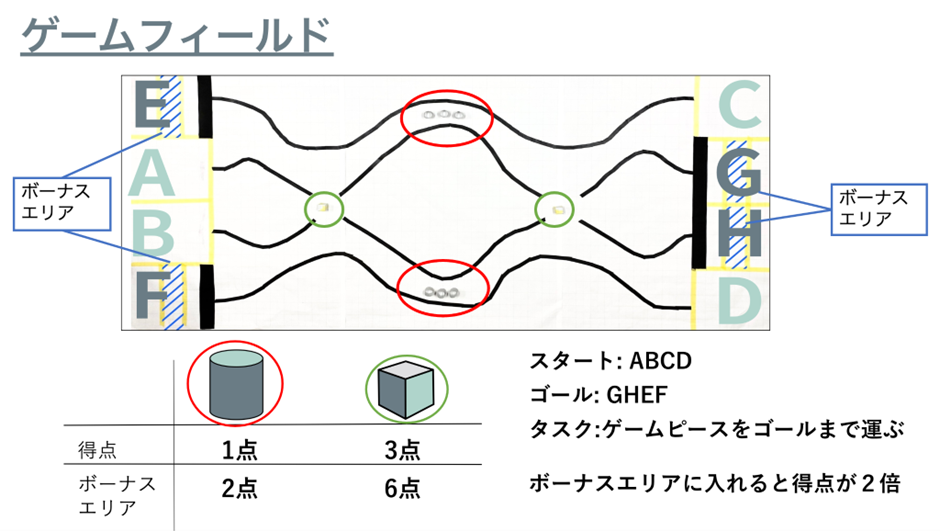 利用するゲームフィールド上は黒いテープで線が引かれており、ワークショップ中に学んだ「ライントレース」を活用して、ゲームピースを運びます。車体の改造を通じてゲームピースの運搬をサポートするなど、プログラミングだけでなく、ほかの工夫も可能な非常に自由度の高いゲームです。