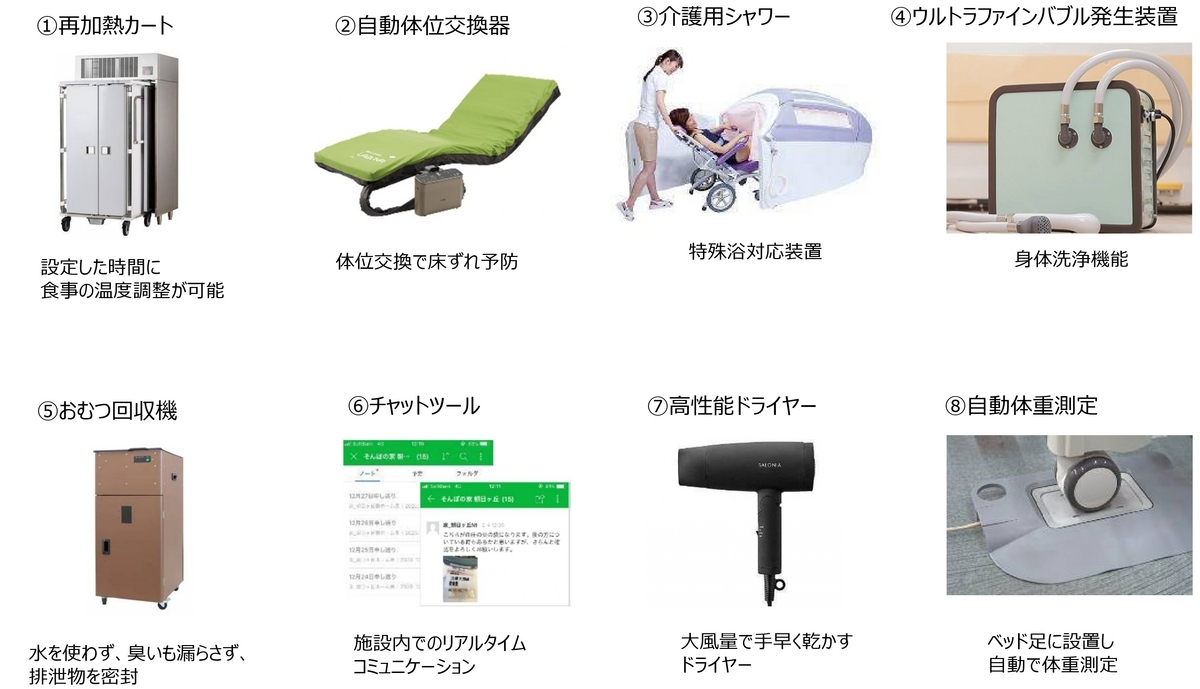ほかにも、15分毎に自動で体圧をバランスよく分散させることで床ずれを防止する「自動体位交換器」や、ウルトラファインバブルを充満させた湯船に浸かるだけで身体の汚れが落ちる「ウルトラファインバブル発生装置」など、サービスの質を改善しつつ、職員の負担軽減になるようなテクノロジーが揃う。