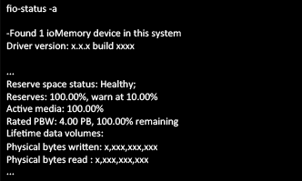 fio-status -aコマンドの出力の"Rated PBW: x.xxPB, xx.xx% remaining" で最大書き換え容量(xx.xxPB)
