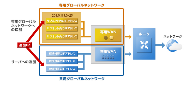 専用グローバルネットワーク」をご利用の場合は必ず本サービスで提供するサブネット内のIPアドレスへの切り替えが必要となり、サーバ初期提供時に標準付帯されているIPアドレスを同時にご利用いただくことはできません。