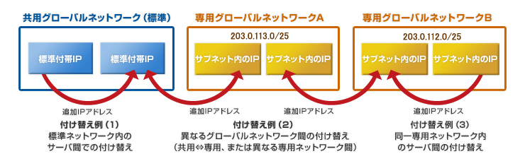 - 追加IPアドレスは、同一の会員IDでご利用いただいている他サーバおよび他グローバルネットワークへ付け替えることが可能です。