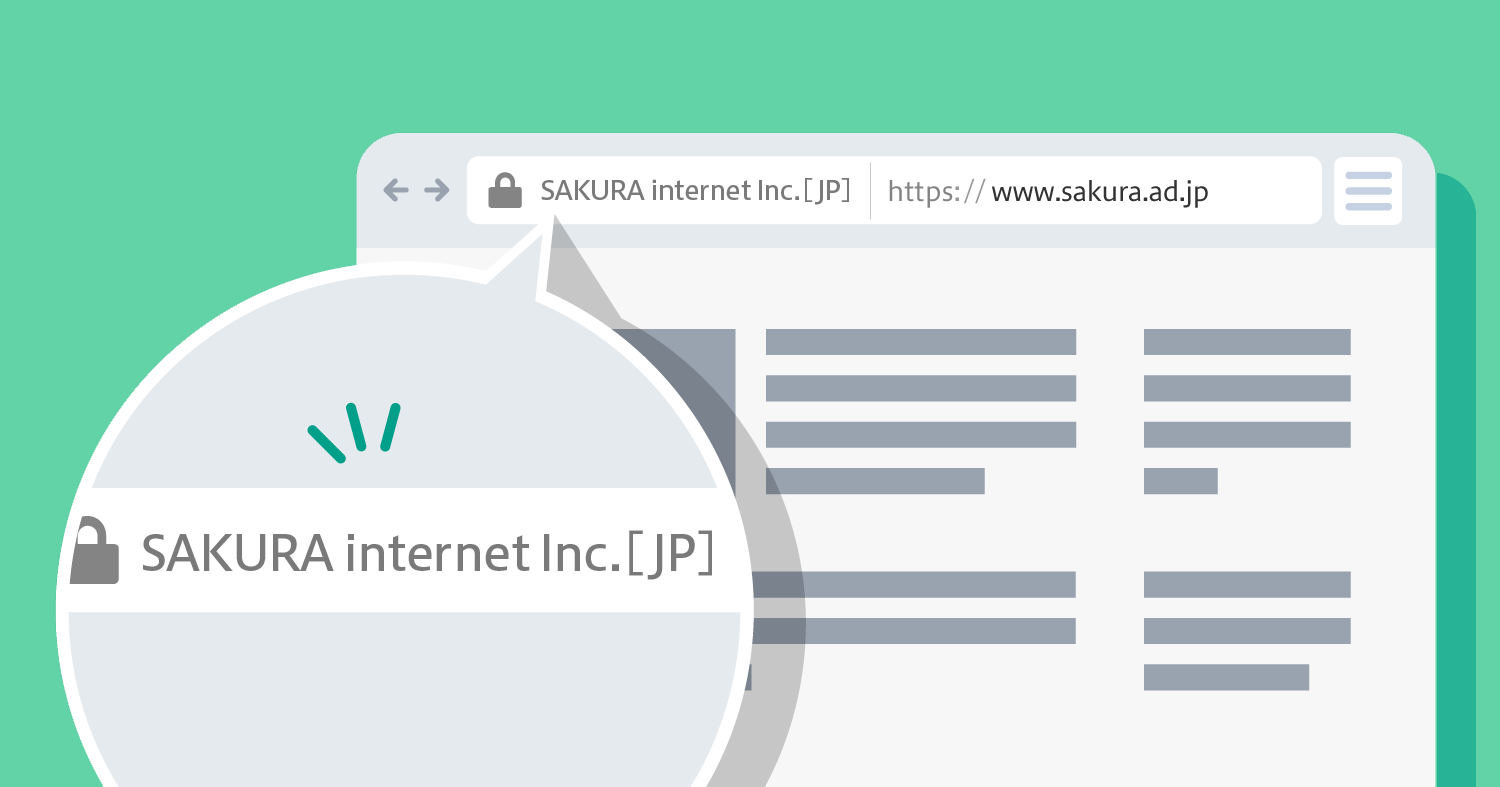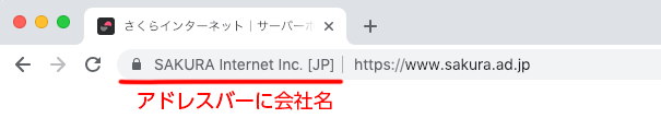 EV証明書の特長を「アドレスバーに会社名を表示」と説明しましたが、この機能のメリットとは何なのでしょうか。それはアドレスバーに会社名を表示することにより、例えば「このサイトはSAKURA internet Inc. が運営しています!」とサイトを閲覧に来たユーザに明示することができることです。