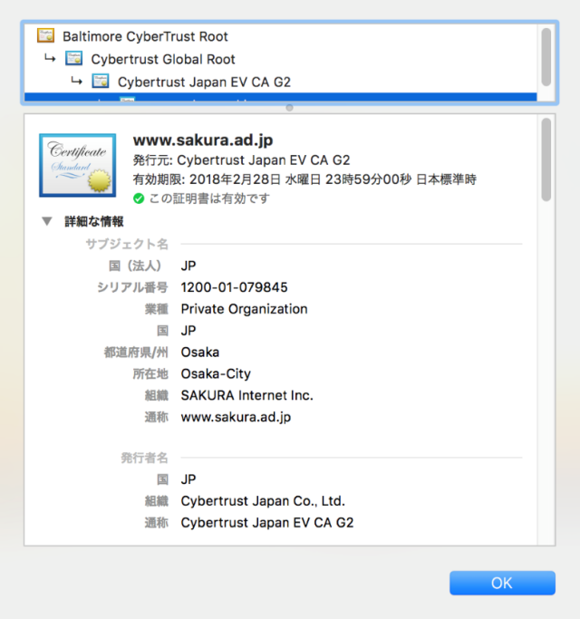 以前は銀行や証券会社、クレジットカード会社などの金融機関のサイトで利用されることが多かったのですが、特に今年から業種を問わず普及が加速しており、数多くの企業サイトで導入されるようになってきました。もちろんOV証明書でも組織認証のため証明書内に運営組織の記載はされますが、以下の画像のようにブラウザ上で操作して証明書の詳細を表示をしないと確認できません。