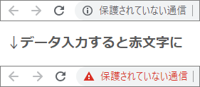 現時点で最新版であるChrome69では、https化されていないサイトのアドレスバーに「保護されていない通信」(Mac OSの場合は「保護されていません」)という警告がグレー文字で常に表示されています。10月16日にリリース予定のChrome70では、サイト内のテキストボックスに文字を入力すると、この警告が赤文字に切り替わるため、より警告表示が目立つようになります。