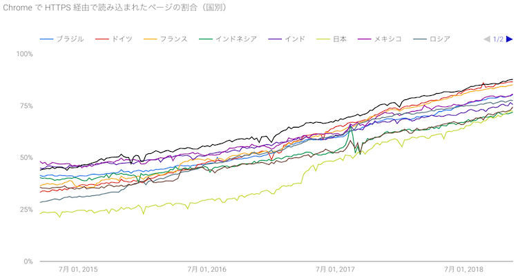 これまで「ウェブサイトのSSL化が遅い」と言われ続けてきた日本(一番下の薄緑色)ですが、ここに来てようやく他国と比べてあまり差のない割合にまで到達しました。ウェブサイトの運営者や無料SSL機能を提供してきた事業者、啓蒙活動を行ってきた認証局の活動などが実を結んだ結果と思われます。しかしながら、まだ進捗率が他国に比べて低いのは事実なので、これからも引き続きSSL化に関する啓蒙活動、利便性強化を行っていくことで日本のウェブサイトを早期により高い普及率へ引き上げて行く必要があると考えられます。