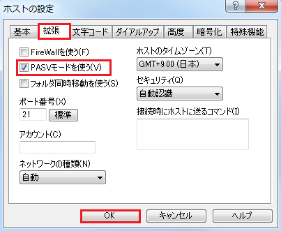 『 拡張 』タブを選択し、『 PASVモードを使う 』の項目をチェックします。