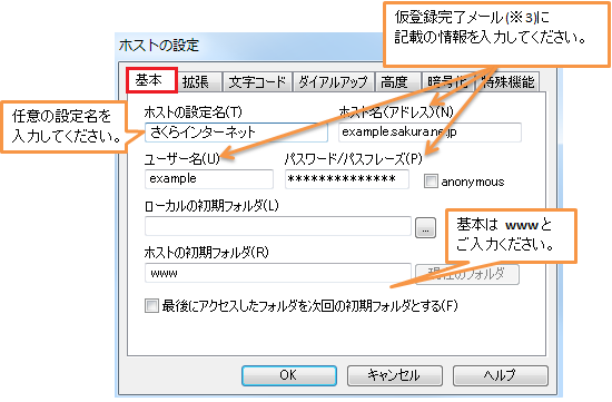 • ※4 FTPアカウント名は、「仮登録完了のお知らせ」あるいは「登録完了のお知らせ」を確認してください。