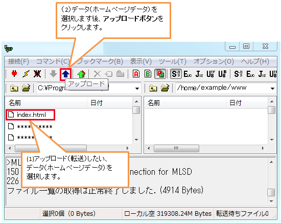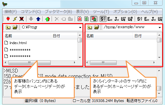 サーバへの接続を確認後、左側のウィンドウ(お客様の端末)からファイルを選択し、