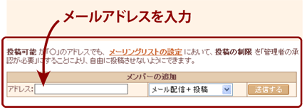 2.リストメンバ一覧が表示されている画面において、画面下部に図2のような入力フォームがあるので、登録したいメールアドレスを入力します。